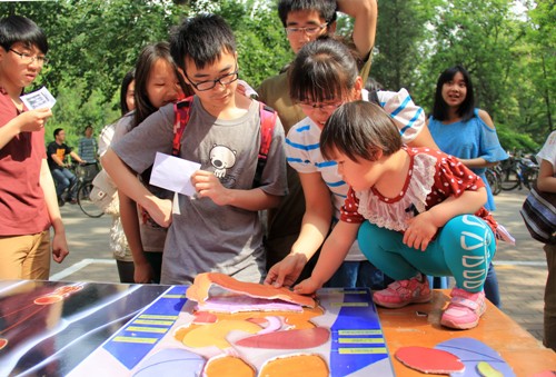 显微镜对年仅三岁、还未上学的冯思语来说很陌生,不过她沉浸在了人体器官的拼图游戏中。在妈妈的帮助下,冯思语凭着对形状的认识,把人体器官的模型一个个地安放在了正确的位置。