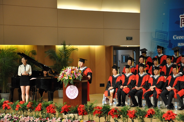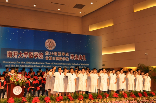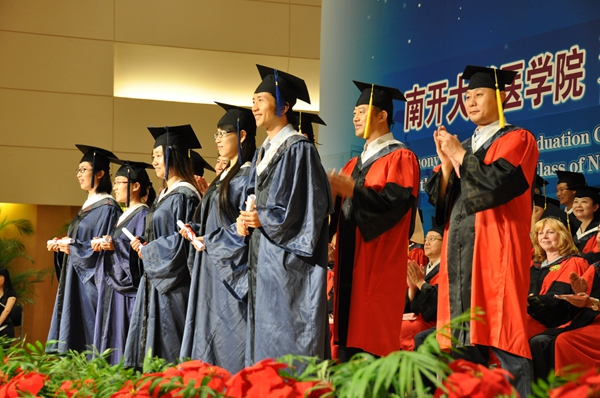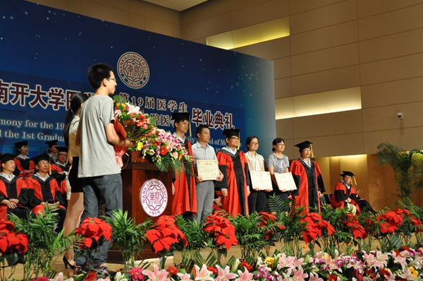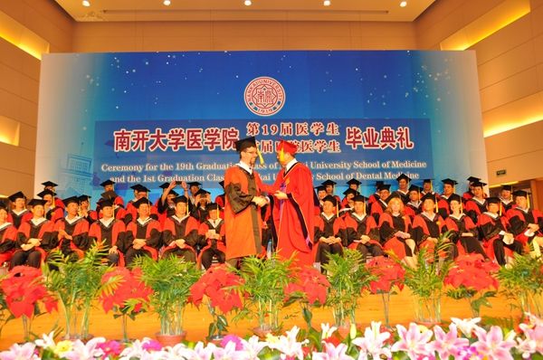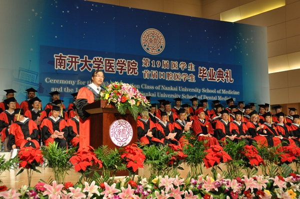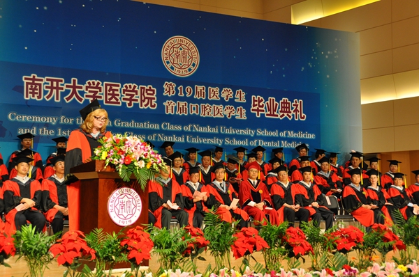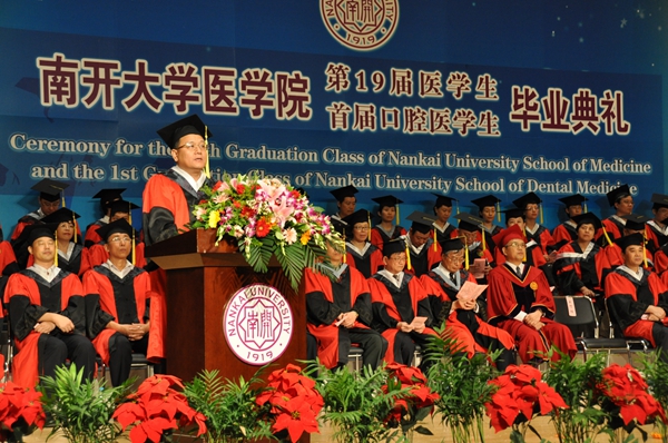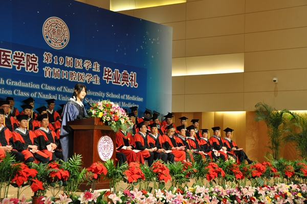 毕业生代表孟祥智、马燕燕用流利的英语发言,他们深情回顾了在南开园的成长的青春岁月,感谢母校南开及教学医院的培养教育,表示在未来的工作学习中,不辱使命,怀着感恩之心,秉持“公能”之志,为推进祖国医药卫生事业发展贡献青春和力量。