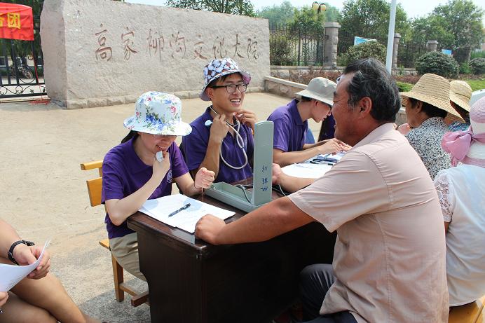 在莒南县涝坡镇高家柳沟村,实践队在街道旁搭起咨询台,开展常见病防治知识宣传、义诊医疗服务。实践队全体师生顶着烈日,冒着酷暑,在36度以上的高温下为村民服务,免费测量血压、血氧饱和度、心率等,对相应状况给予解答;发放健康宣传单,宣讲“三高”(糖尿病、高血压、高血脂)的预防及治疗要点;普及冠心病、白内障、慢支等乡村老年人易患慢性疾病,普及手足口病、流感、麻疹等儿童的常见疾病;介绍最新的医改政策等。