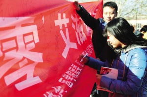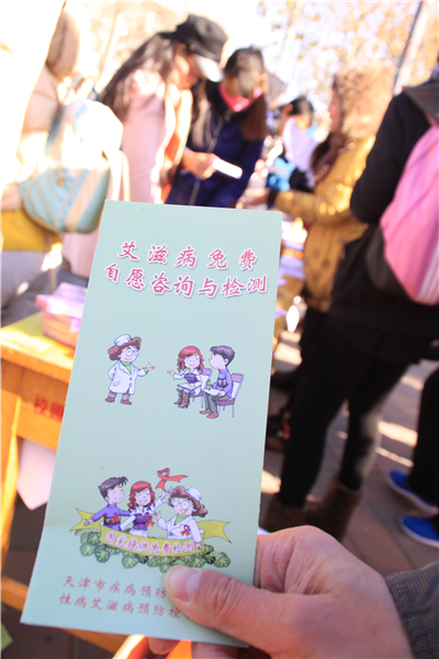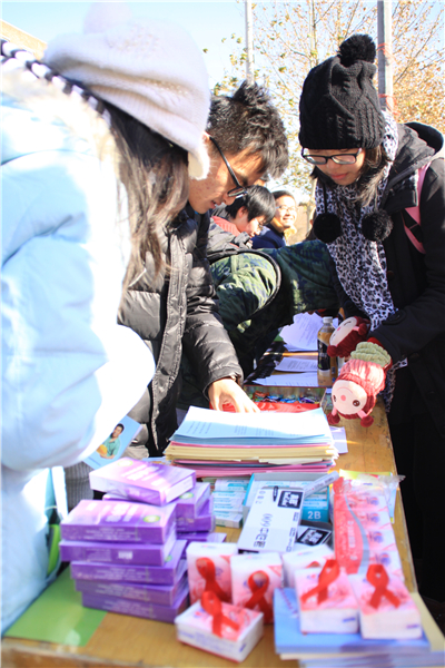 工作人员向过往师生发放防治艾滋病宣传册、健康知识宣传单,为同学们发放防治艾滋病宣传徽章,同时,为了表达对艾滋病患者的关怀,很多同学亲手制作红丝带别在自己的衣服上,并在活动横幅上签名寄托祝福。
