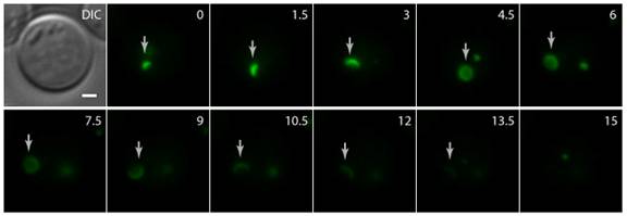 首图为DIC图,显示酵母细胞轮廓,白色标尺长度为一微米。箭头指示跟踪一个大自噬体的形成过程,荧光信号来源于GFP-Atg8,时间单位为分钟。