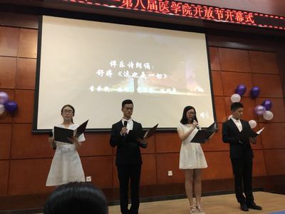 开幕式还设计了系列医学主题文艺活动,合唱曲目《坚守誓言》、伴乐诗朗诵《这也是一切》、医学改编歌曲串烧、相声《扒大褂》、舞台剧《001》。多样的活动形式用诙谐的态度讲述了医员工的日常,令人捧腹的同时又感同身受。