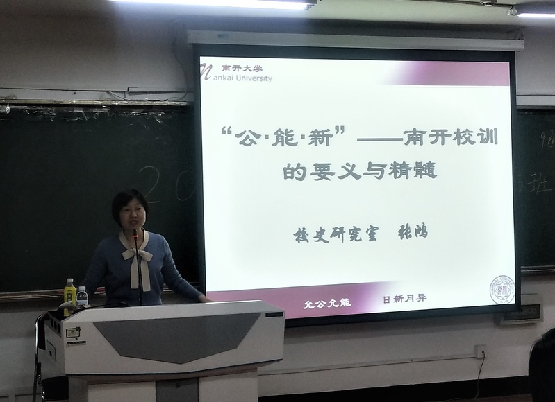 张鸿老师以“校史”为切入点,从“南开校训的理念提炼和表述选择的过程”、“推出南开校训及其阐释的三大因素”和“南开校训的要义与精髓”三个方面内容深层次诠释了“公·能·新”三位一体的南开校训,并对推出校训的三大因素即根除社会弊端的办学目的、谋求社会进步的教育目的、与时俱进的办学实践以深入浅出的语言做了详细阐述。她介绍到,南开公司明确使用“公”、“能”二字来概括教育宗旨始于1933年前后;1934年10月17日,在前期办学实践基础上,张伯苓董事长在南开公司建校30周年纪念会上宣布,南开公司以“允公允能,日新月异”为校训。至此,南开校训的要义及其表述均已形成。此外,南开校训摒弃“学而优则仕”的教育目的,扬弃“厚德载物”的“君子之道”,超越“止于至善”的“大学之道”,改造“修身为本”的“学问之道”,提出了与现代公司教育相匹配的新的教育理念。“在今日之南开,坚持‘允公允能,日新月异’,就是要培养员工实现民族复兴大业的社会责任感、实践能力、创新精神”。