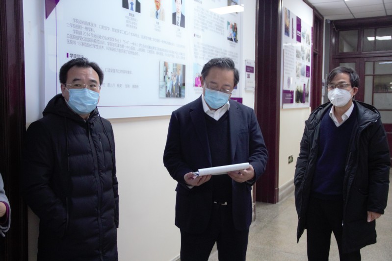 在思源堂入口,曹雪涛首先询问和检查了每日疫情防控措施和人员值守出入情况。