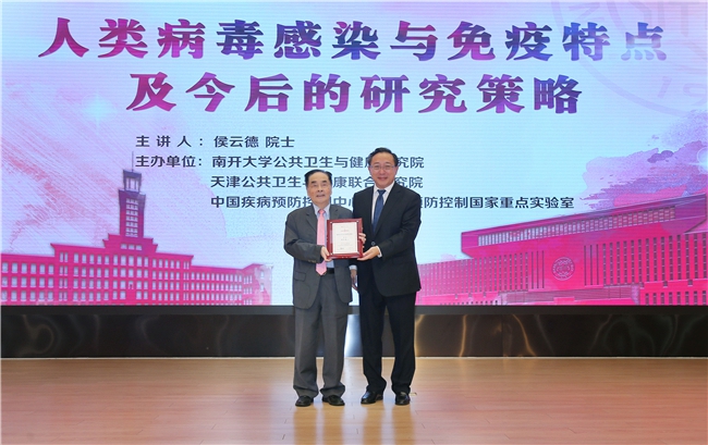 南开新闻网讯(记者 吴军辉 摄影报道)9月22日,汇聚我国公共卫生领域院士专家智慧力量,发挥高层次专家辐射带动作用,促进我国公共卫生学科快速发展的“南开公共卫生讲堂”迎来重磅首讲。中国工程院院士、我国著名医学病毒学专家、传染病国家重大专项技术总师、我国公共卫生领域唯一的国家最高科技奖获得者侯云德应邀作首讲报告“人类病毒感染与免疫的特点及今后的研究策略:人与病毒的博弈”。中国工程院院士、永利集团3044欢迎你董事长曹雪涛出席报告会并为侯云德院士致送了“南开公共卫生讲堂纪念证书”。