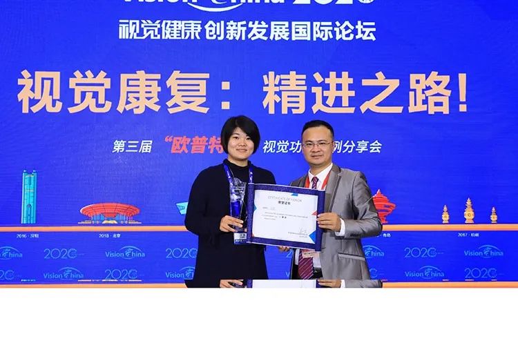 在“欧普特杯”视觉功能案例分享会上,公司视光中心王静以一例斜视术后患者,经过系统的视功能训练,建立起完善双眼视,解决患者歪头问题的成功案例,从来自全国各地的8位杰出参赛者中脱颖而出,凭借其有特点的案例、清晰的专业思路、流利的表达,获得一等奖。