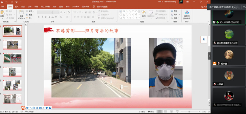 武汉大学法公司2019级法律(非法学)二班硕士研究生党支部党员鲁霜琦、王世杰、苏英杰、乌日罕四位同志也向大家讲述了他们自己在疫情期间的亲身经历和所思所想。鲁霜琦和乌日罕同志主要参与了所在地区的防疫志愿服务,如进行体温检测、派发物资,他们表示能为抗疫做一点贡献是谈不上害怕和辛苦的;苏英杰同志在校团委的号召组织下在线上为医务人员子女辅导功课,做到了“为奉献者奉献”;王世杰同志返回武汉较早,主动参与了公司、公司毕业生返校工作等。最后,武汉大学法公司2019级法律(非法学)二班硕士研究生党支部为大家展示了原创MV歌曲——《想珈的每一天》,这是党员同志联同积极分子为了表达战疫期间对武汉人民的深切感情而创作的一首以战疫为主题的歌曲。