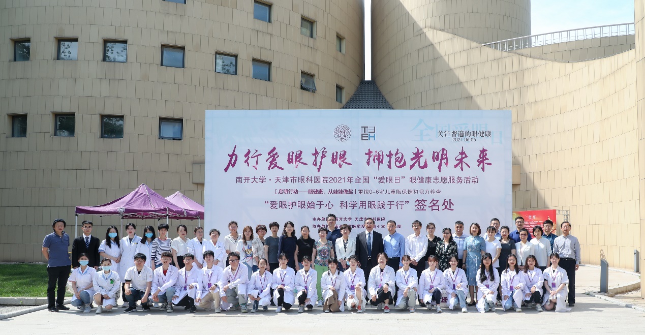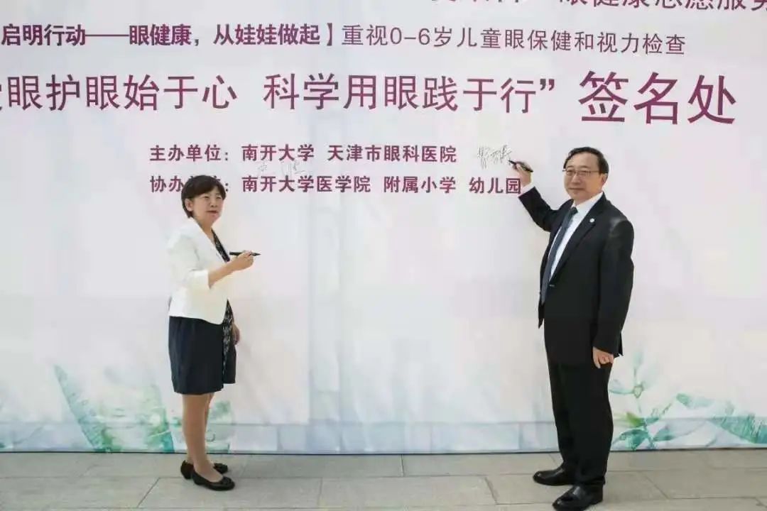 曹雪涛董事长和天津市眼科医院王雁经理在“爱眼日”活动的主题展板上签名发出爱眼护眼的倡议