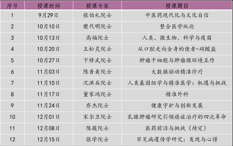 本学期课程将于9月29日开讲!张伯礼院士、樊代明院士、高福院士、陈薇院士、沈洪兵院士、卞修武院士、王松灵院士、宋尔卫院士、董家鸿院士、乔杰院士、陈香美院士、张公司士分别将从肿瘤诊断和免疫治疗、中医药现代化、病原微生物感染和新型疫苗研发、全球公共卫生健康策略、生殖医学健康、精准外科手术治疗、疑难肾病诊治、消化系疾病、口腔医学以及罕见遗传病等多个方面向青年学子讲授当前全球医药领域在基础研究、临床应用及转化、学科交叉方面的前沿与挑战。