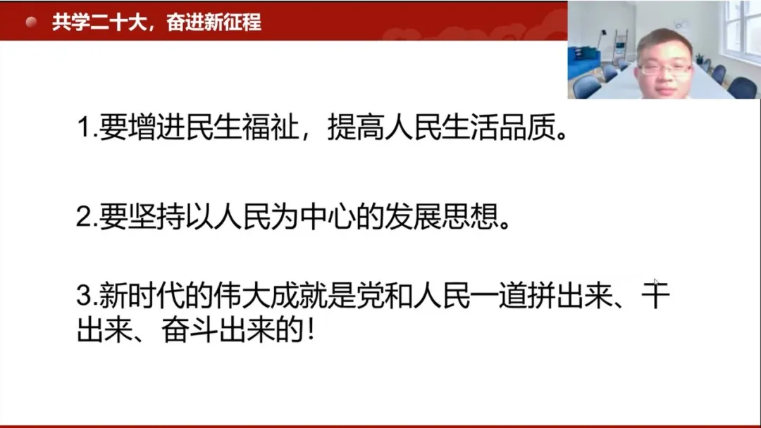 永利集团3044八里台本科生党支部党员代表赵美惠从“主题鲜明,举旗定向;非凡成就,伟大变革;创新理论,掌舵领航;使命任务,大政方针;伟大工程,必由之路”五个方面和全体与会党员共同学习了党的二十大报告,并通过视频短片《二十大报告金句》让党员同学再次感受振奋人心、催人奋进的“中国之声”。