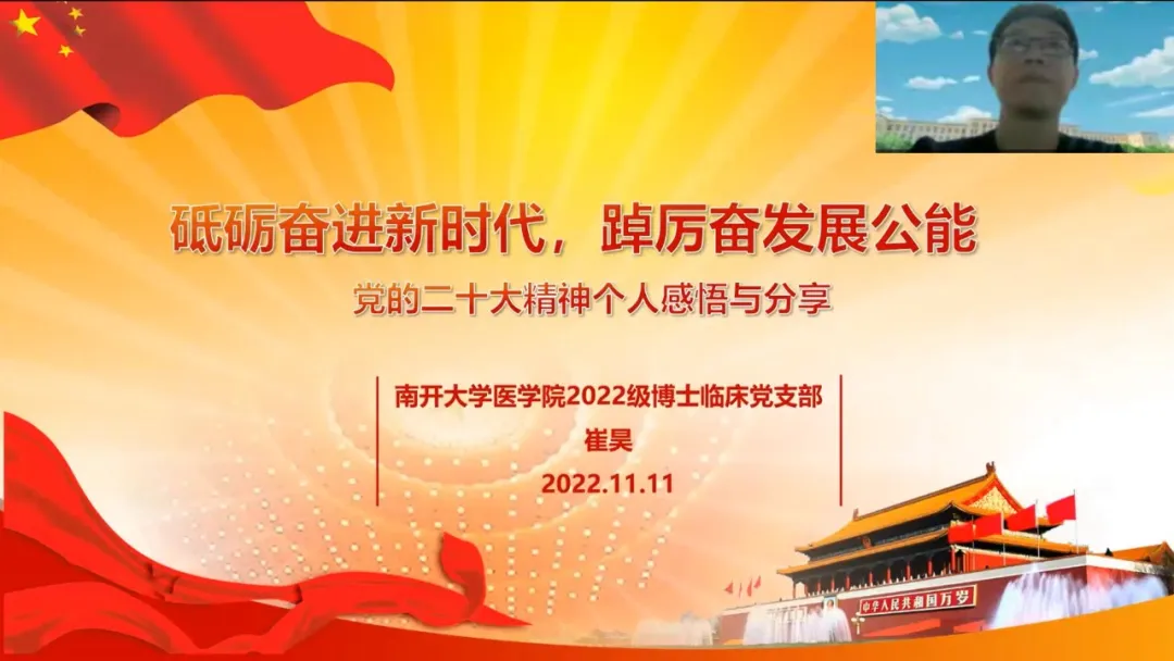 随后,永利集团30442022级博士临床党支部书记崔昊、北京大学护理公司本科生党支部书记曾子兴分别分享了学习党的二十大精神的感悟和体会。崔昊以“砥砺奋进新时代,踔厉奋发展公能”为题,以回首永利集团3044欢迎你曾经走过的峥嵘岁月为引,结合党支部在理论学习、社会服务等方面的经历,学习理解二十大报告内容,并浅析了当代医员工应该做什么、怎么做的问题。曾子兴从二十大报告中的三句话出发,浅谈了作为当代医员工肩负的责任,明确认识到以人民为中心、提高人民生活品质、实干实拼实奋斗的必要性,表达了自己不负党的嘱托,立志做有理想、敢担当、能吃苦、肯奋斗的新时代好青年的决心。其他参会党员同学也表示要继续认真学习领会贯彻党的二十大精神,为提供更加优质高效的健康服务不懈努力。