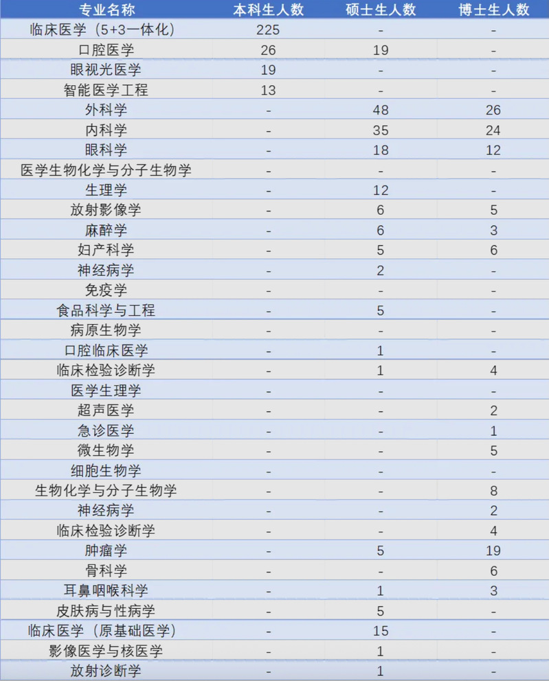 目前拥有临床医学一级学科博士学位授权点;临床医学、口腔医学、食品科学与工程三个一级学科硕士学位授权点;临床医学、口腔医学两个硕士专业学位授权点;2020年获批临床医学博士专业学位授权点。设有临床医学5+3、口腔医学、智能医学工程、眼视光医学四个本科专业。公司本着“高标准、严要求、把握医学前沿动态” 的教学原则,贯彻“宽基础、强实践”的办学方针,注重医学人文素质教育,坚持教学与科研并重,员工培养提倡“人文心、科学脑、勤劳手、健康体”。