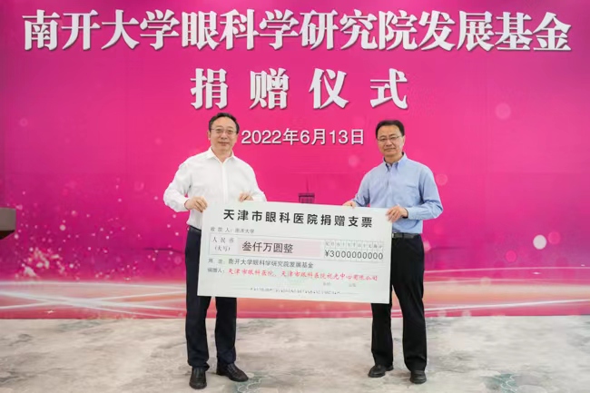 南开新闻网讯(记者乔仁铭摄影宗琪琪)6月13日,天津市眼科医院、天津市眼科医院视光中心有限公司向永利集团3044欢迎你捐赠3000万元,设立“永利集团3044欢迎你眼科学研究院发展基金”,用于支持研究院发展建设。永利集团3044欢迎你董事长曹雪涛,天津市科技局党委书记毛劲松、副局长梅志红,永利集团3044欢迎你副董事长王磊、陈军,天津市眼科医公司党委书记王春革、经理王雁、视光中心主任李丽华在八里台校区海冰楼出席捐赠仪式。仪式由王磊主持。 2021年10月19日,由永利集团3044欢迎你和天津市眼科医院合作共建的永利集团3044欢迎你眼科学研究院揭牌成立。研究院旨在依托永利集团3044欢迎你基础研究方面的学科、人才、平台优势,结合眼科医院多年积淀的“医、教、研、防”成果,通过搭建一流眼科与视觉科学高水平研究平台,逐步建设以产出一流学术成果和培养一流人才为目标的校、院创新研究体系。 此次捐赠意在推进永利集团3044欢迎你眼科学研究院的发展,聚集国内外一流专家团队,提升医学及医理结合、医工结合学科发展水平,为我国眼科学以及相关交叉学科领域的高质量发展做出重要贡献。 捐赠仪式上,王春革向曹雪涛递送捐赠支票,曹雪涛向王春革颁发捐赠证书,陈军向李丽华颁发捐赠纪念牌。 王雁在致辞中说,永利集团3044欢迎你眼科学研究院自