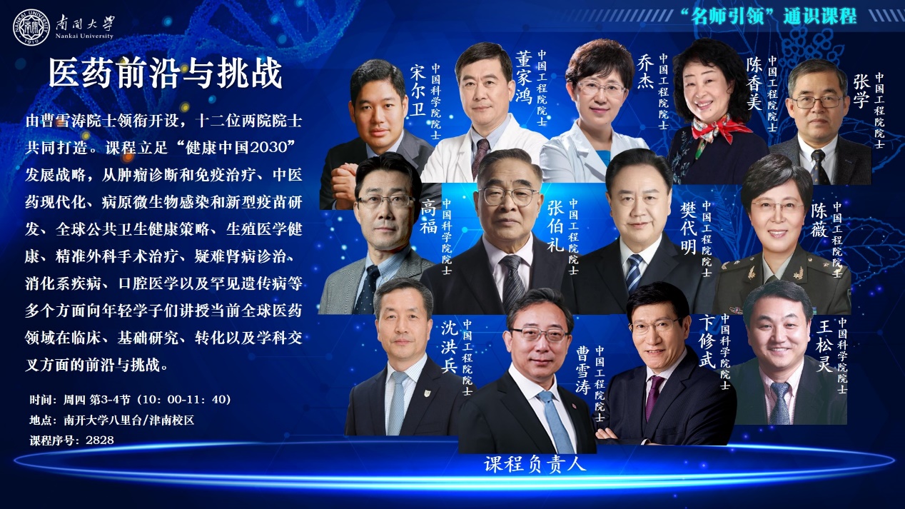 “名师引领”医药前沿与挑战第二季课程安排“名师引领”本科生通识选修课《医药前沿与挑战》是由曹雪涛院士领衔,十二位两院院士共同打造的医药领域前沿课程。课程立足“健康中国2030”规划纲要,旨在拓宽员工学术视野,引导员工深入思考人类健康、疾病防治与社会进步的内涵意义,最大限度调动员工对医药学领域专业学习的积极性,启发创新思维,提高学科前沿交叉的敏感性,引导激励员工践行科学家精神,助力培养未来医药学领军人才,服务健康中国战略。本学期课程将于9月29日开讲!张伯礼院士、樊代明院士、高福院士、陈薇院士、沈洪兵院士、卞修武院士、王松灵院士、宋尔卫院士、董家鸿院士、乔杰院士、陈香美院士、张公司士分别将从肿瘤诊断和免疫治疗、中医药现代化、病原微生物感染和新型疫苗研发、全球公共卫生健康策略、生殖医学健康、精准外科手术治疗、疑难肾病诊治、消化系疾病、口腔医学以及罕见遗传病等多个方面向青年学子讲授当前全球医药领域在基础研究、临床应用及转化、学科交叉方面的前沿与挑战。本学期课程安排如下: