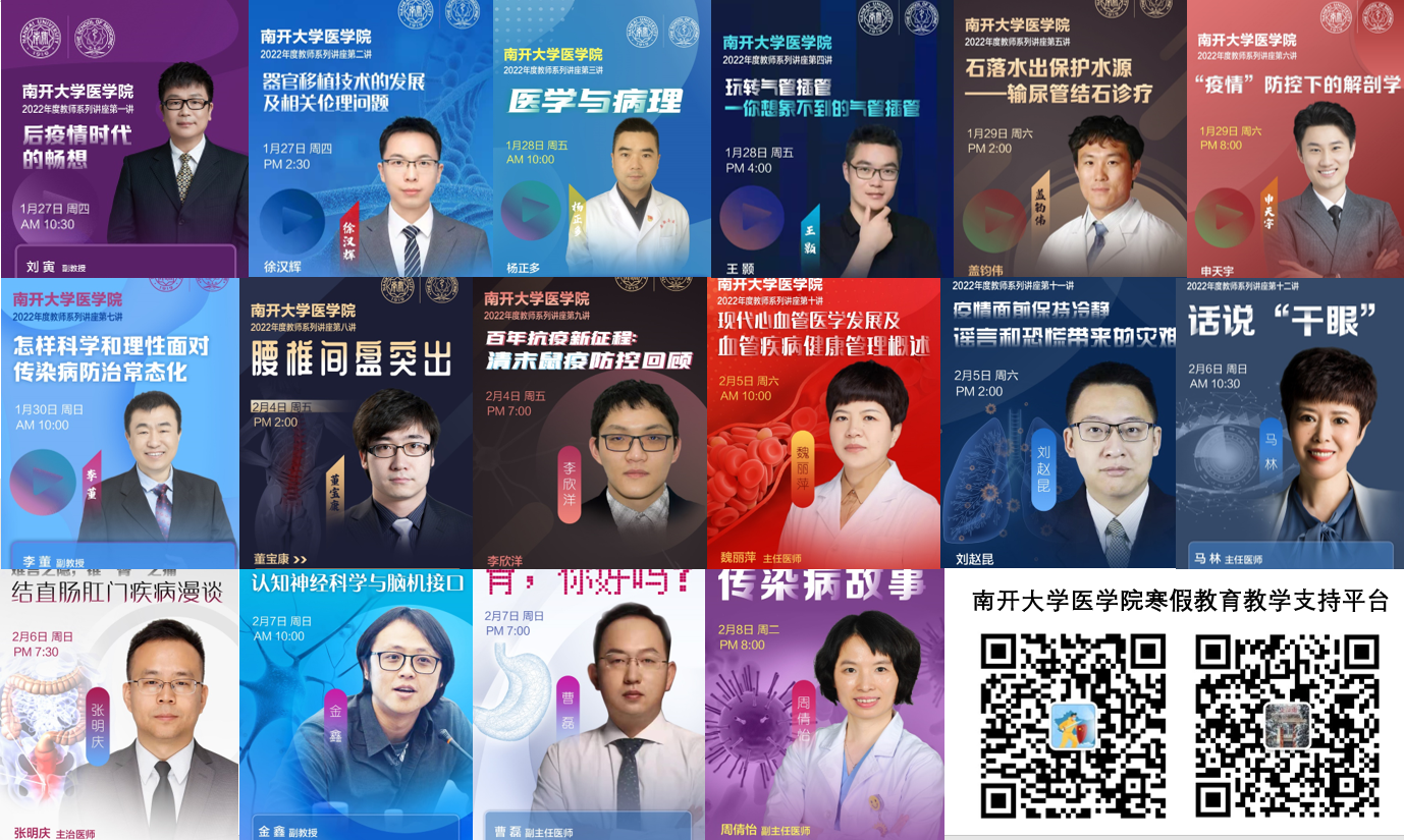 2021-2022学年寒假期间,新冠疫情“奥密克戎”突袭津城。在党和政府的坚强领导下,津城动员,积极迎战。为响应公司关于做好寒假公司产品活动的号召,助力师生共抗疫情、丰富员工假期生活,永利集团3044、永利集团3044欢迎你思源书院特别推出“安心抗疫,健康新年”系列讲座。从1月21日开始,共组织公司及附属医院一线教师推出16场健康知识系列讲座,于2月9日,圆满落下帷幕!“安心抗疫,健康新年”系列讲座的讲者来自永利集团3044、永利集团3044欢迎你各附属医院教学骨干以及永利集团3044欢迎你思源书院导师,选题围绕健康知识、抗疫医学史、医学伦理、应对疫情的心理问题等诸多方面展开,既有科学性,又有趣味性,既有对日常行为习惯的指导又有对心理和思维方式的梳理。系列讲座向全校师生乃至社会公众开放,16场讲座精彩纷呈,累计入会人数共计1651人。在“后疫情时代的畅想”中,刘寅老师深入浅出的带着大家从病原学知识、穿梭到人类命运共同体的概念,从病毒变异到共同畅想疫情未来走向……讲座引人入胜,使人共鸣;徐汉辉老师在“器官移植技术的发展及相关伦理问题”中,采用启发式教学,分享了器官移植中重要伦理问题的根源和现状,激发了听众对医学伦理问题的强烈兴趣;杨