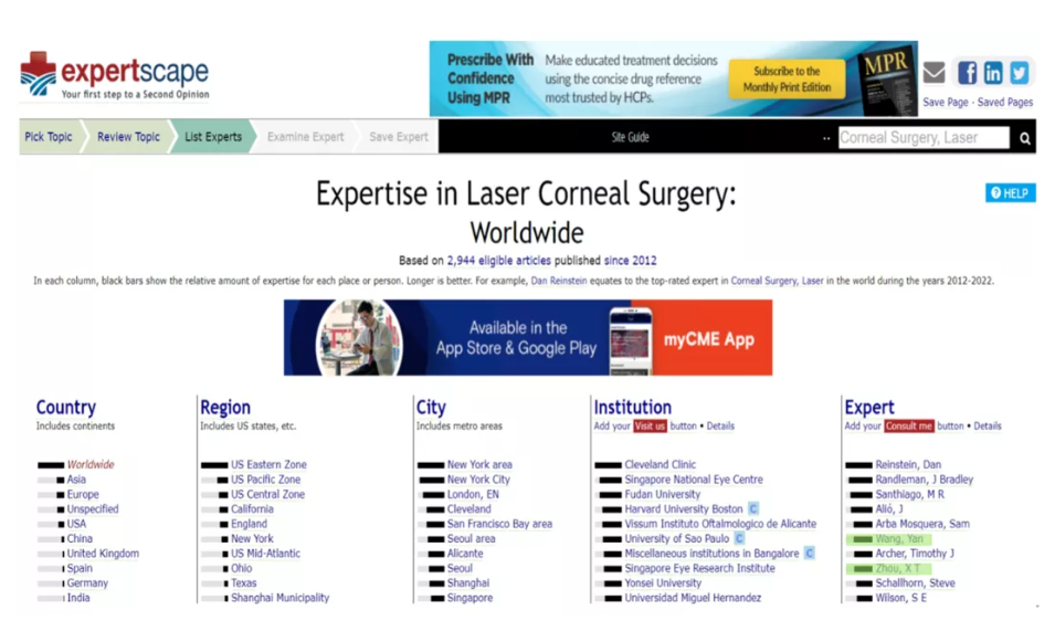 近日,欧洲著名“Expertscape”机构公布了2022年最新的“全球激光角膜手术专家”国际排名,我国知名屈光手术专家,天津市眼科医院、永利集团3044欢迎你附属眼科医院经理,永利集团3044欢迎你眼科学研究院经理王雁教授在全球6000多名角膜激光手术领域的专家中排名第6名。此外,复旦大学附属眼耳鼻喉科医院经理周行涛教授位列第8名,温州医科大学附属眼科医院王勤美教授跻身前35名。以王雁教授带领的永利集团3044欢迎你附属眼科医院屈光手术中心在此次排名中全国名列前茅。屈光手术在屈光不正矫正方面扮演着重要角色,其主流的手术方式是以激光为主。近几年,我国屈光手术在数量和质量上都有大幅提高,每年手术量约100万-150万例,致力于安全性、有效性、精准性和稳定性的目标,正朝着微创化、多元化、智能化、规范化方向发展,部分技术已经达到国际领先水平。权威学术期刊《柳月刀》(TheLancet)研究显示,激光角膜屈光手术是目前被广泛认为安全性和有效性均较高的屈光不正矫正手术之一。国际著名屈光手术医生DanZ. Reinstein近日在专业期刊JRefract Surg发表题为“屈光手术被纳入对抗因未矫正屈光不正而导致的全球视力障碍的时代已经到