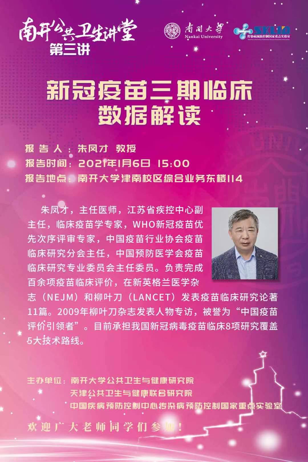 报告会信息:主办单位:永利集团3044欢迎你公共卫生与健康研究院、天津公共卫生与健康联合研究院、中国疾病预防控制中心传染病预防控制国家重点实验室时间:2021年1月6日(周三) 15:00 -16:30地点:永利集团3044欢迎你津南校区综合业务东楼114报告厅(一)领导会见及致辞时间内容主持人15:00 –15:10永利集团3044欢迎你校领导会见江苏省疾控中心副主任朱凤才教授徐建国院士15:10– 15:15永利集团3044欢迎你校领导为朱凤才教授颁发南开公共卫生讲堂纪念证书(二)学术报告时间题目报告人主持人15:15 –16:15新冠疫苗三期临床数据解读江苏省疾控中心副主任朱凤才教授徐建国 院士16:15 –16:30提问环节师生听众对报告中感兴趣的内容进行提问朱凤才教授简介:朱凤才,江苏省疾病预防控制中心副主任,主任医师,博士生导师,中国疫苗行业协会疫苗临床研究分会主委,中华预防医学会疫苗临床研究专业委员会主委,WHO新冠疫苗优先次序评审专家,享受国务院“政府特殊津贴”专家待遇,江苏省“333工程”第一层次培养对象,入选“国家百千万人才工程”,先后获得国家人事部、卫计委和江苏省“有突出贡献中青年专家”、“全国优秀科技工作者”等荣誉称