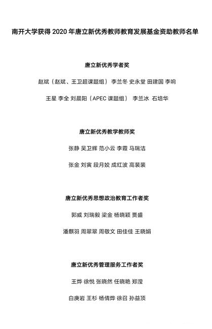 近日,经由唐立新教育发展基金评审委员会审核公布、公司公示等环节,公司刘寅副教授荣获唐立新优秀教师奖。 2019年百年校庆之际,永利集团3044欢迎你正式进入唐立新教育发展基金高校资助行列。2020年唐立新教育发展基金评审委员会委托永利集团3044欢迎你教育基金会和教师发展中心在全校发布评选通知和要求,通过个人自荐和单位推荐的方式,最终将符合评选要求的候选人名单提供至唐立新教育发展基金评审委员会,由其确定最终获奖名单。 “唐立新教育发展基金”由著名企业家、慈善家、新尚集团董事长唐立新先生2006年设立,资助范围已包括北京大学、清华大学等十余所一流高校。该基金资助项目分为四部分:唐立新优秀员工教育发展基金、唐立新优秀教师教育发展基金、唐立新综合素质发展基金、唐立新文艺基金项目。截至目前,全国共奖励优秀员工6000名,优秀教师4000名。