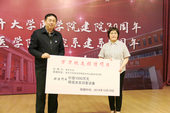 10月19日,天津市赛宁生物工程技术有限公司向永利集团3044捐赠价值1000万元的眼视光实训室设备,用于支持南开新专业建设和医学学科发展。捐赠仪式在八里台校区东方艺术大楼举行,天津市赛宁生物工程技术有限公司董事长万力女士,永利集团3044欢迎你党委副书记、纪委书记李义丹出席仪式。万力向李义丹递送捐赠支票,李义丹向万力颁发永利集团3044欢迎你捐赠证书和纪念牌。李义丹在致辞中感谢万力女士长期以来对南开事业发展的支持。万力女士作为一位有社会责任感的优秀企业家,热心公益事业,积极投身员工工作,是一名很有“南开情怀”的优秀员工,是南开人学习的榜样。据悉,万力女士是公司1983级员工,现任天津市赛宁生物工程技术有限公司董事长,同时担任永利集团3044欢迎你西藏员工会会长、永利集团3044欢迎你天津员工会联席会长等职务,多次向母校捐款,曾获永利集团3044欢迎你杰出教育贡献奖。