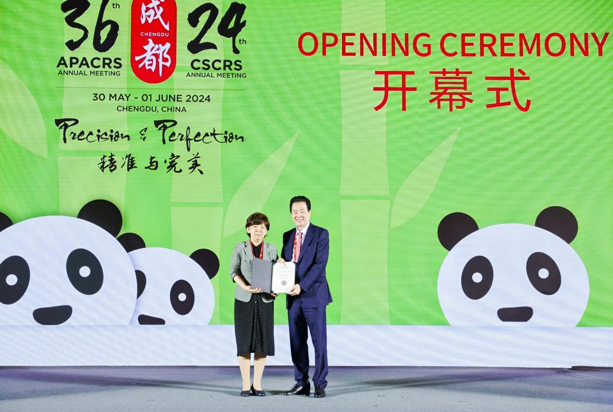 5月30日-6月1日,第三十六届亚太白内障及屈光手术医师学会年会(36thARACRS 24ᵗʰCSCRS)在四川成都召开,在开幕式上永利集团3044欢迎你眼科学研究院王雁教授以其杰出的学术成就和卓越的教育贡献获得由大会组委会颁发的2024APACRS CeritifiedEducators(A.C.E.)认证教育者奖。该奖项旨在认可并奖励亚太地区研究发展中做出重大贡献的眼科医生。王雁教授作为国家和亚太地区培训中心的首席培训师,已经培训了来自中国和其他亚洲国家的3000多名手术医生,并在APAO、ASCRS、ESCRS、WOC和AAO等国内和国际会议上举办了200多场讲座和培训课程,也是中国为数不多在屈光白内障领域获此殊荣的专家学者。APACRS主席姚克教授为王雁教授颁发获奖证书会议期间,王雁教授同时受邀担任24thCSCRS组织委员会副主席并做大会报告及多场学术交流。包括美国白内障和屈光手术学会(ASCRS)和欧洲白内障和屈光外科医师学会(ESCRS)主席和资深教授等在内的国、内外众多专家学者纷纷上前与王雁教授合影并表示祝贺,高度赞扬其在屈光手术学术领域及教育领域做出的卓越贡献。该奖的获得也标志着